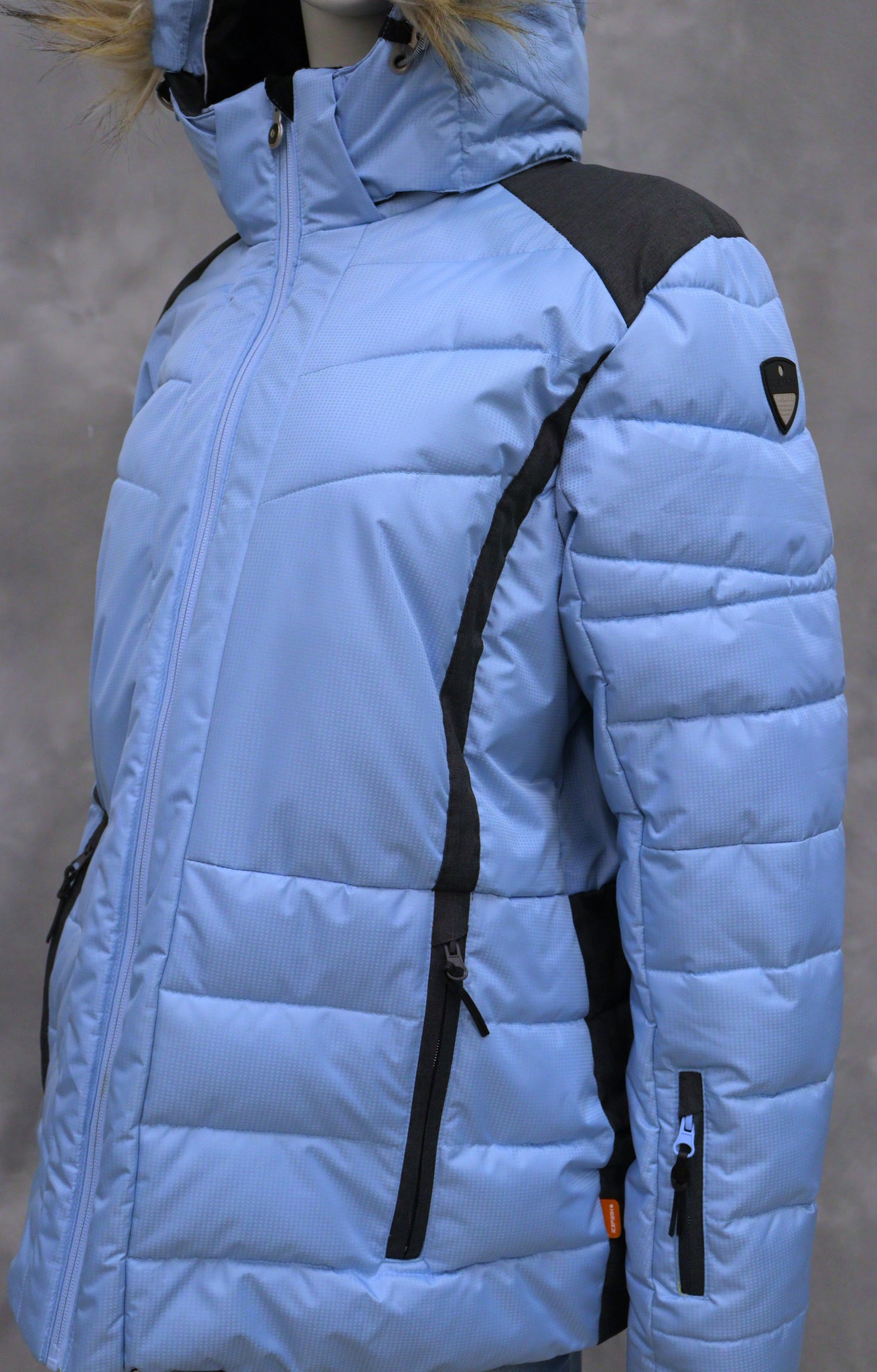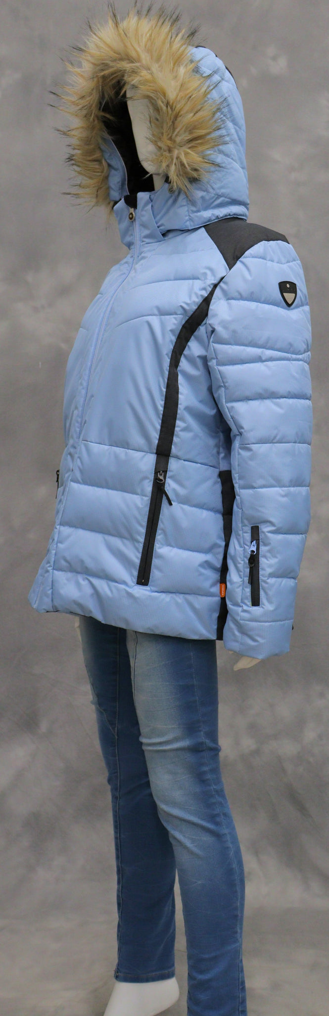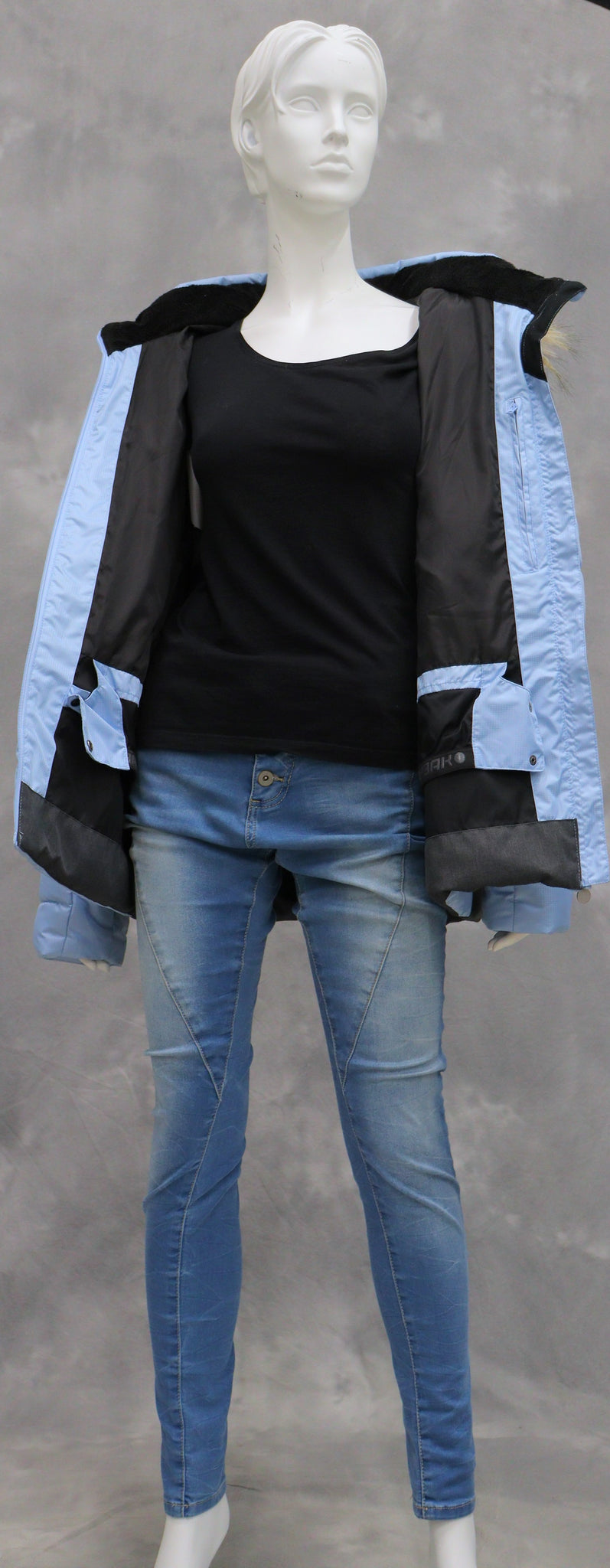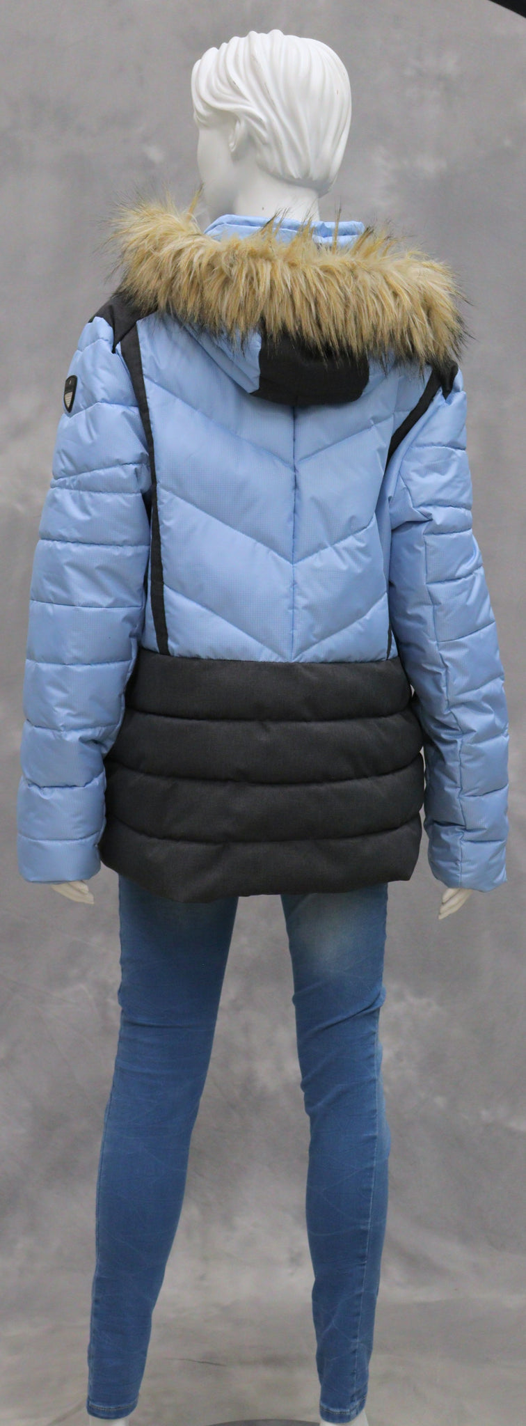 Muuta huomioitavaa: Vetoketjukiinnitys ja vetoketjutaskut. Lumipussi helmassa. Lämmin toppaus ja polyesterivuori. Huppu ja hupussa oleva karva irrotettavissa. Hupussa kuminauhakiristimet. Povi- ja hihatasku.