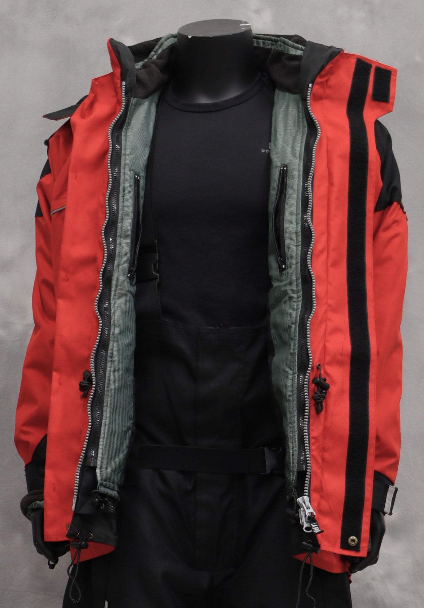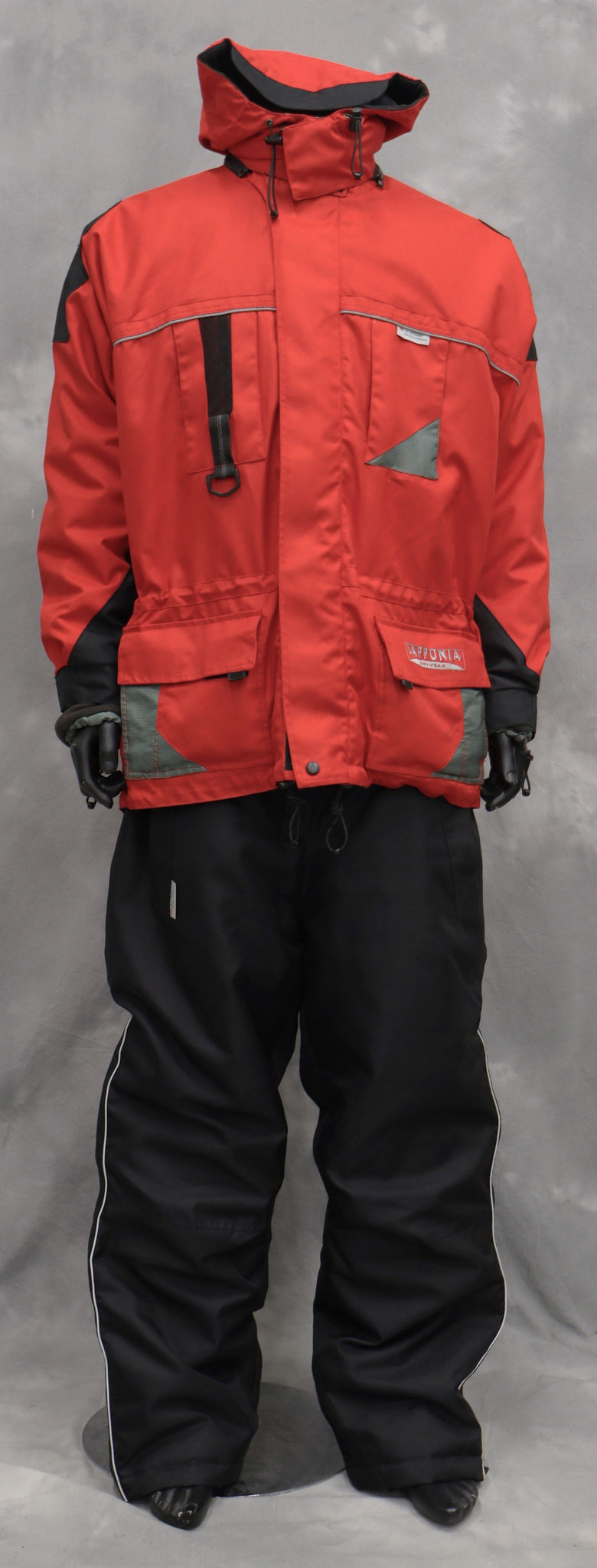 Muuta huomioitavaa: Vanha suomalaismerkkinen kelkka-asukokonaisuus, jossa toppahousut henkseleillä ja punainen toppatakki. Molemmat heijastavaa materiaalia (3M Scotchlite®).