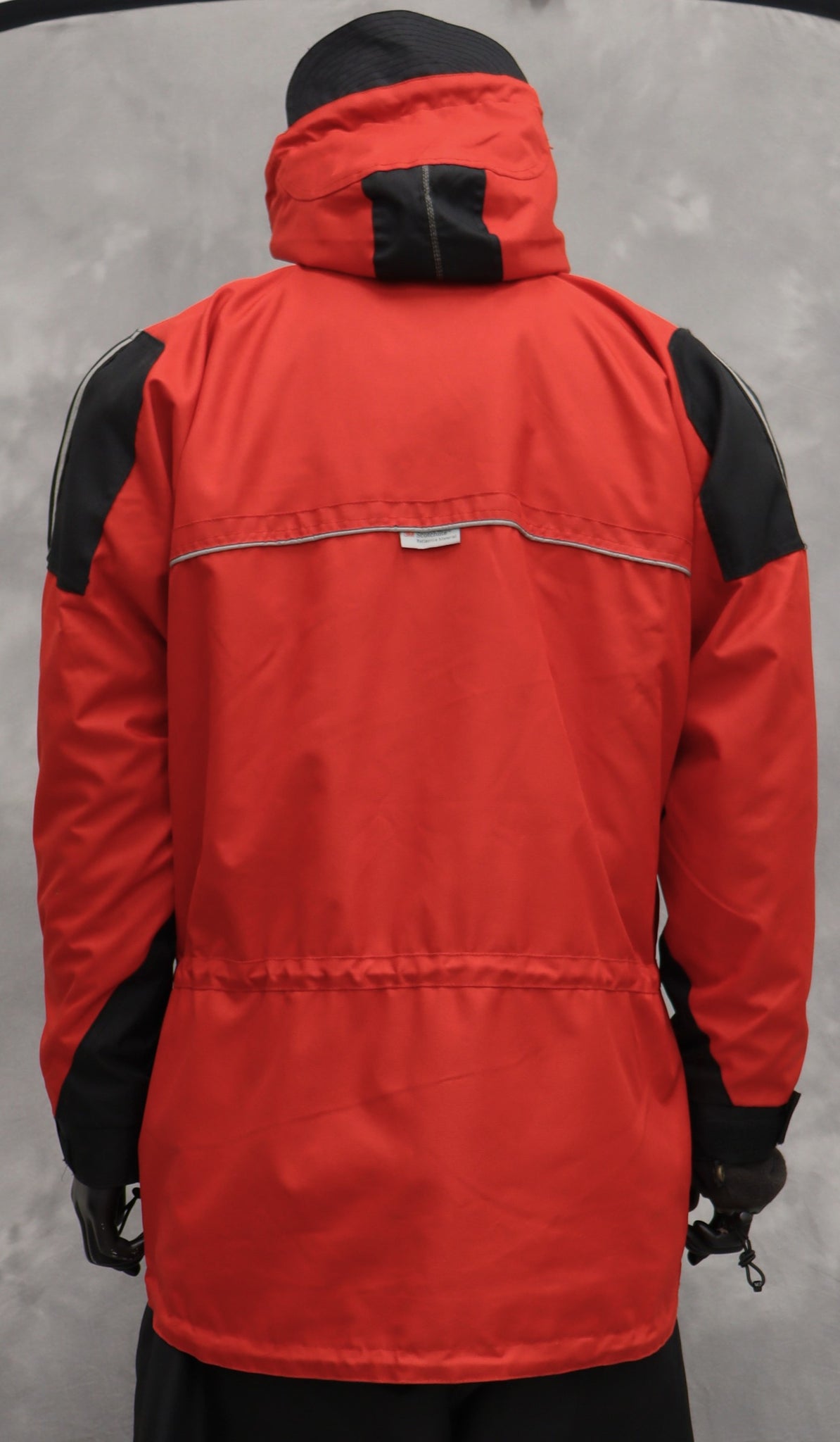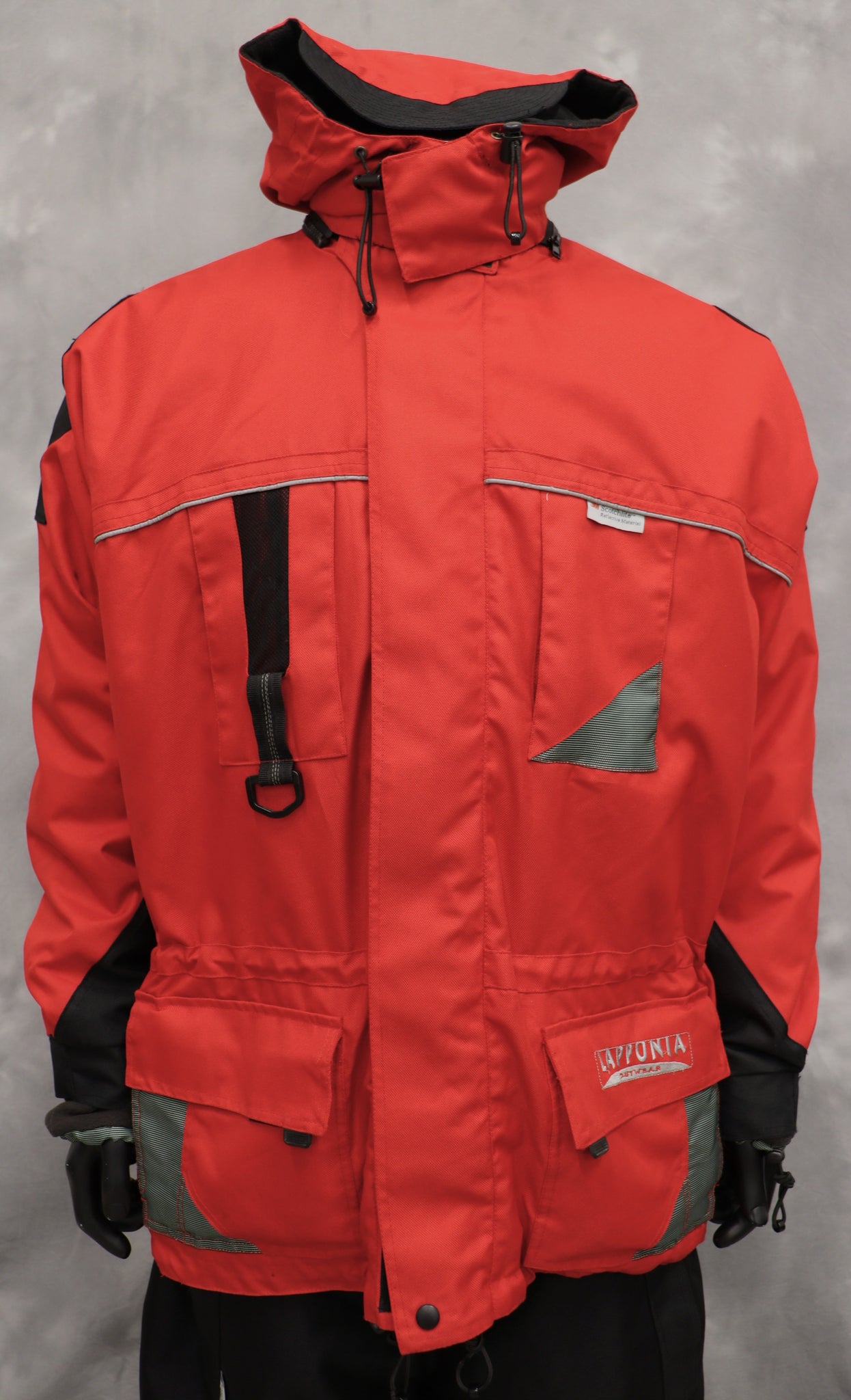 Takissa paljon taskuja ulko- ja sisäpuolella. Vetoketju- ja tarrakiinnitys. Kiristysnyörit vyötäröllä, helmassa, hupussa ja hihoissa ovat kuluneet. Hihansuissa lämmin fleecevuori.