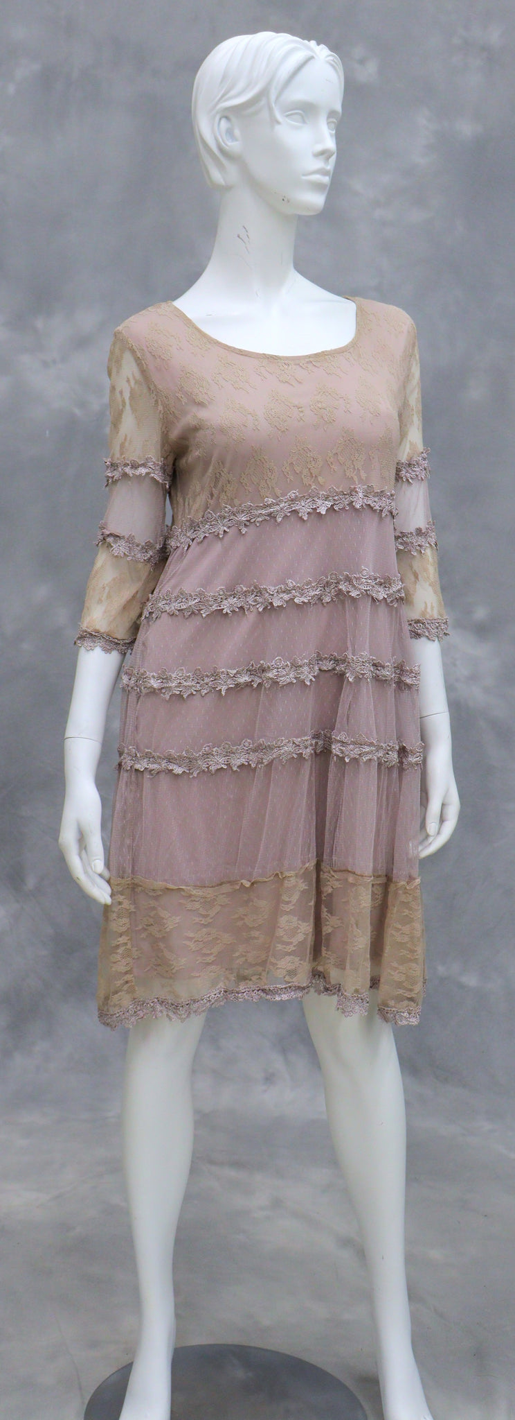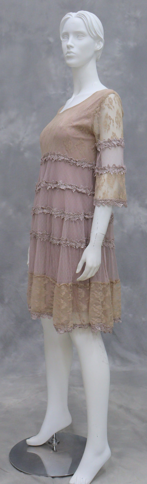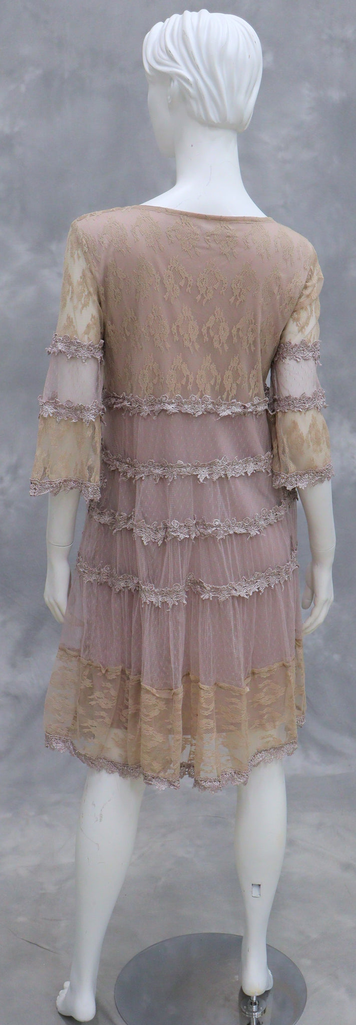 Muuta huomioitavaa: Kuvat vääristävät pitsin kellastuneeksi. Alusmekko, läpikuultavat hihat. Muutamia roikkuvia lankalenkkejä hihoissa ja helmassa.