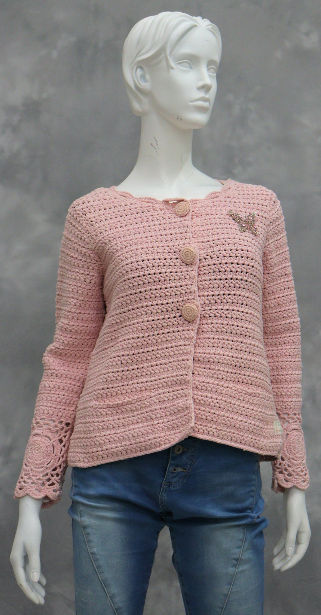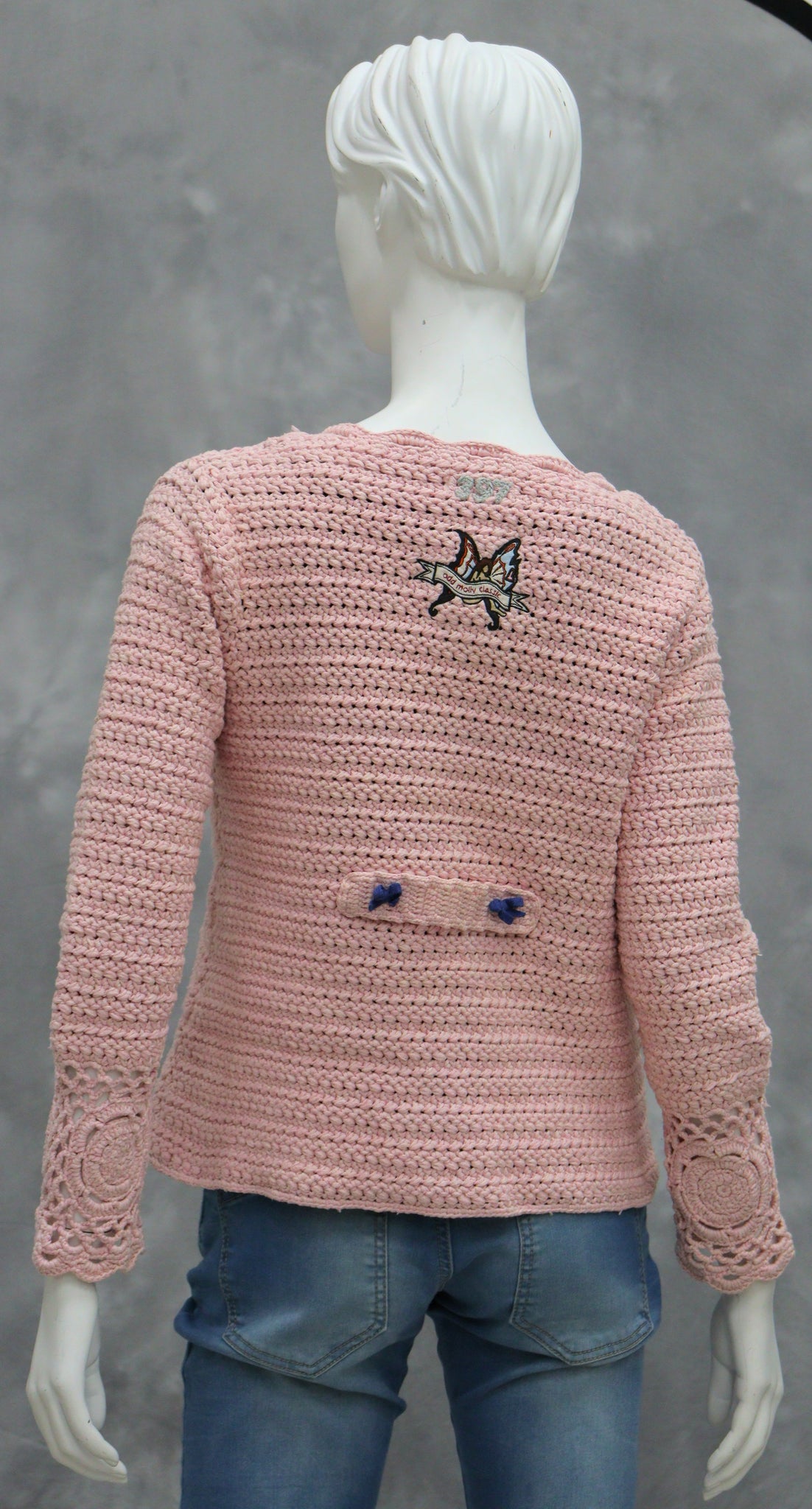 Muuta huomioitavaa: Käsin virkattu. Nappikiinnitys, mukana varanappi. Selässä kangasmerkki "Odd Molly Classic". Alaselässä rusettiyksityiskohdat.