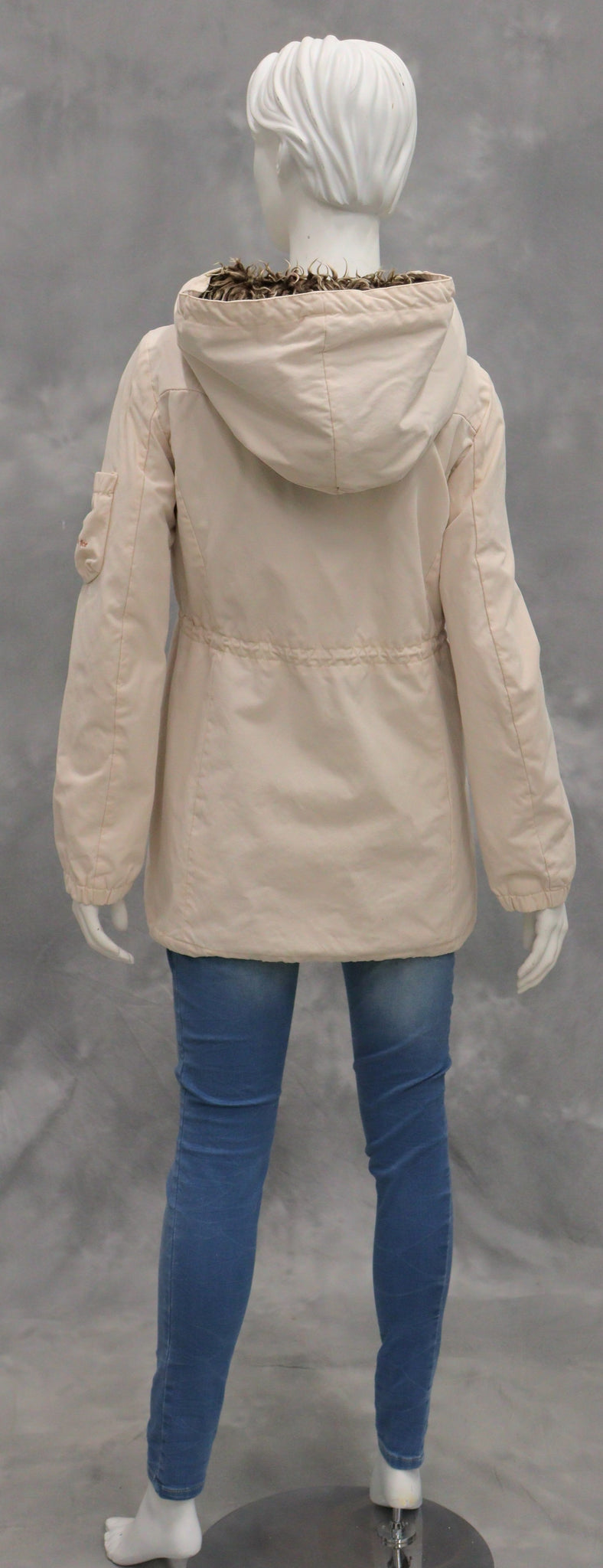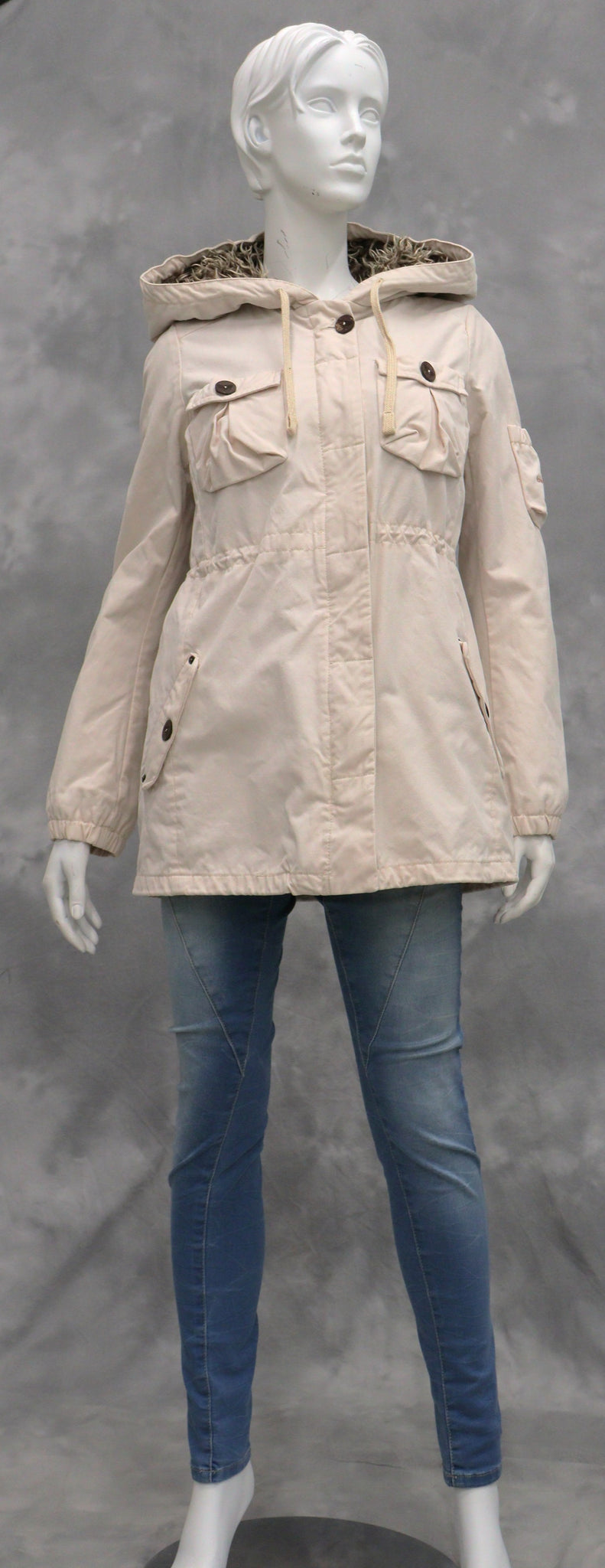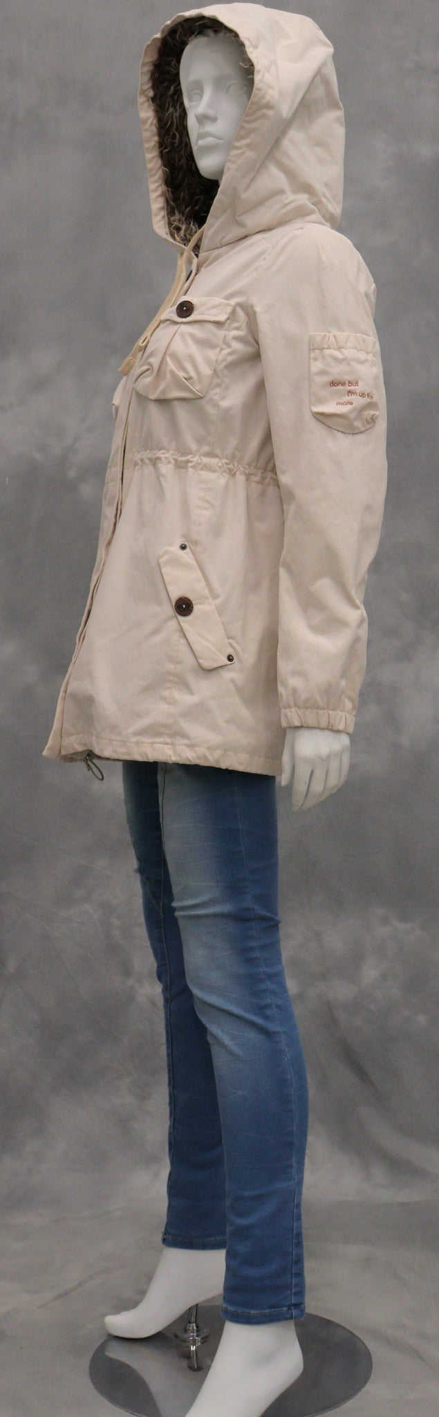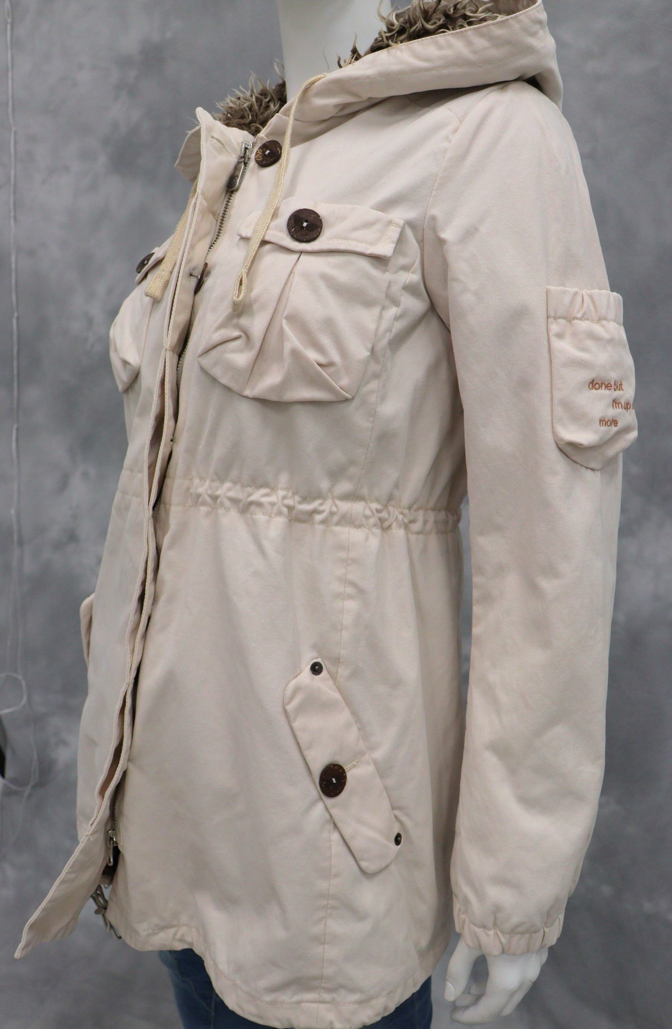 Muuta huomioitavaa: Tuplavetoketju- ja piilonappikiinnitys. Helmakiristys. Edessä rinta- ja vyötärötaskut läppäkiinnityksillä. Lämmin teddykarvavuori hupussa ja selässä. Hihoissa polyesterivuori. Povitasku sisäpuolella (pinkin rusetin kohdalla). Hihatasku tekstillä "Done but I'm up for more".